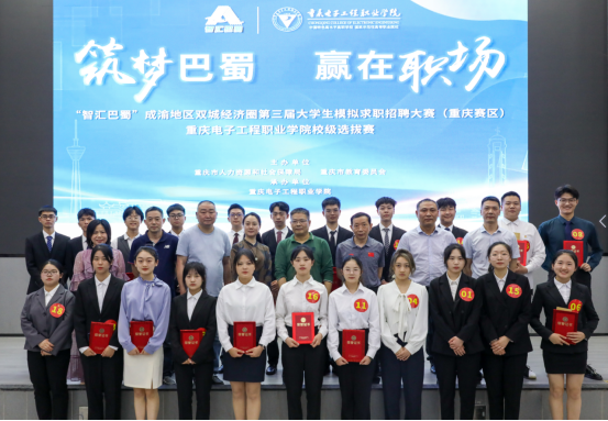4月27日,由重庆市人力资源和社会保障局、重庆市教育委员会主办,重庆电子工程职业学院承办的“智汇巴蜀”成渝地区双城经济圈第三届大学生模拟求职招聘大赛校级选拔赛在博远厅圆满落下帷幕。本次比赛邀请到重庆师范大学财经管理学院分党委书记钟敏、重庆长安集团大师工作室负责人、重庆市五一劳模唐跃辉、重庆电子工程职业学院党委学生工部部长何光明、招生就业处处长王文、重庆市资深就业指导专家田里作评委,比赛开始前重庆电子工程职业学院冉学农副校长为比赛致辞。经过二级学院初赛,22名决赛选手从6871名参赛者中脱颖而出,进入到决赛环节。决赛分为职业生涯规划书展示、选手自我展示和评委老师现场提问三个部分。