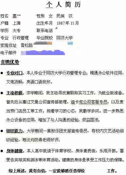 她应聘的是行政文职类岗位,此类岗位除了形象、办公自动化操作、沟通能力,还对态度和写作有一定要求。在自我介绍中,她也标榜自己“学风严谨”,“态度端正”,“认真负责”。可细看这份简历,字号不一,格式不一,字体不一。自我介绍中竟然还有些错字病句!只能说明她做事粗枝大叶,敷衍了事,文字功底糟糕,word操作也未必熟练(连简单的格式对齐都没做好)。试问如何胜任文职工作?