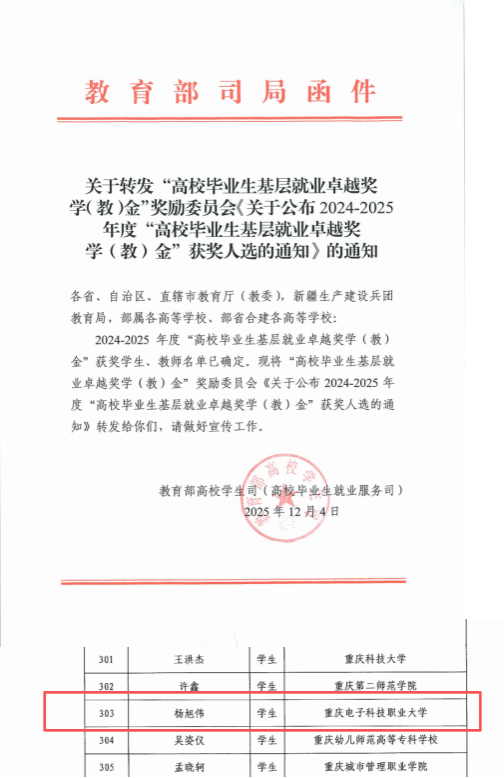 12月4日,教育部公布2024 - 2025年度“高校毕业生基层就业卓越奖学(教)金”获奖名单。本年度全国共评选高校毕业生基层就业卓越奖418人,重庆市共12位毕业生获得该奖项,我校杨旭伟校友获奖,是学校首位获此殊荣的毕业生代表。