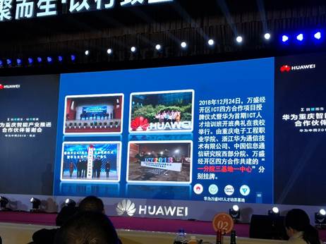 致力于校企合作是我校获得“华为杰出校企合作院校奖”的关键因素。在过去一年里,我校积极与龙头企业华为展开多方面深度合作,促使华为创新的产品和解决方案在重庆应用落地,为建设校企合作生态发挥了重要作用。2018年12月14日,万盛经开区ICT四方合作项目正式揭牌。我校携手浙江华为通信技术有限公司、中国信息通信研究院西部分院、万盛经开区合作共建“一分院三基地一中心”,共同开展电子信息技术中职学历教育和ICT电子信息技术在岗人员技能提升、技能等级培训和岗前培训,为电子信息产业输出“万盛人才”。